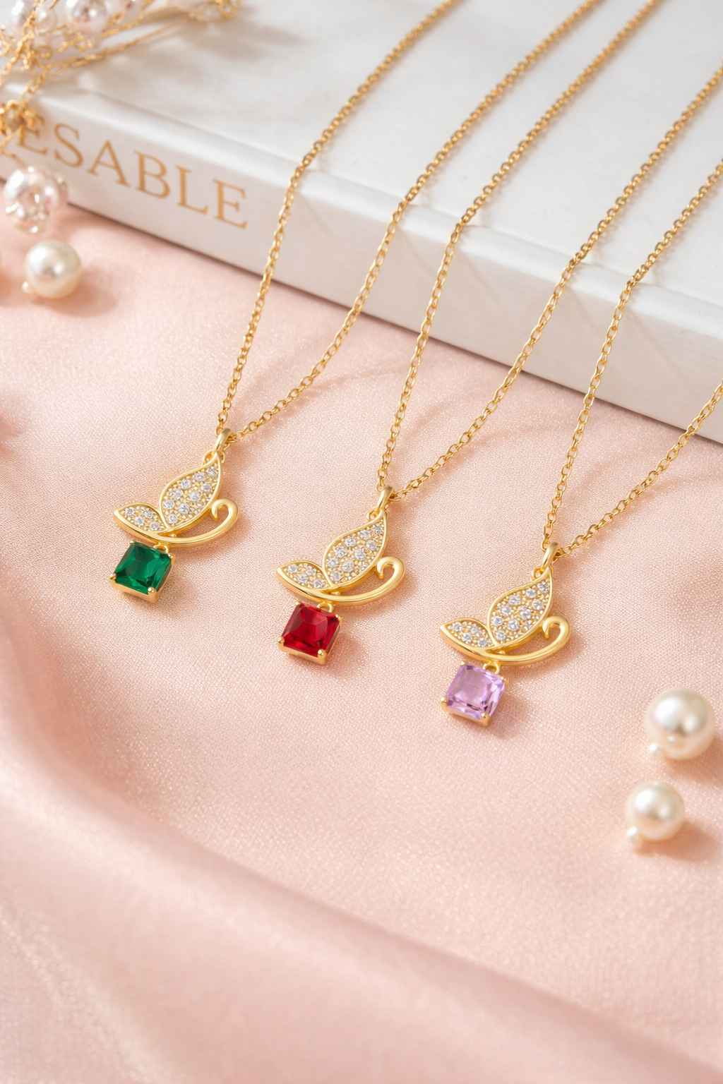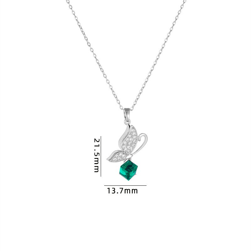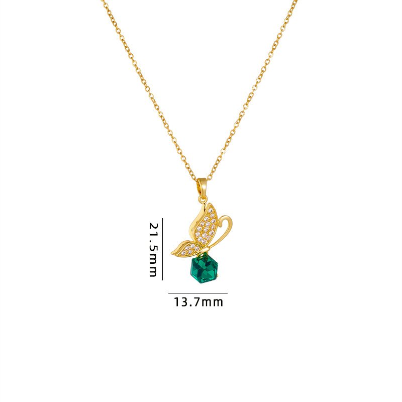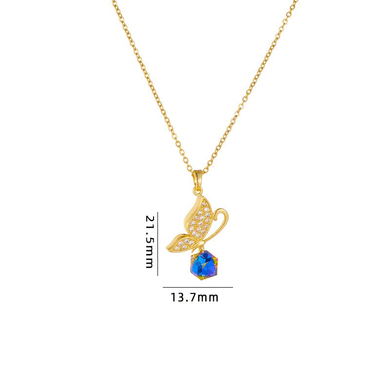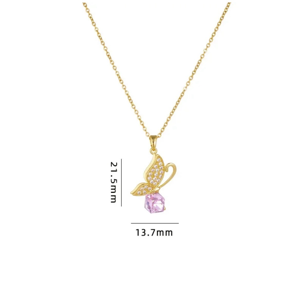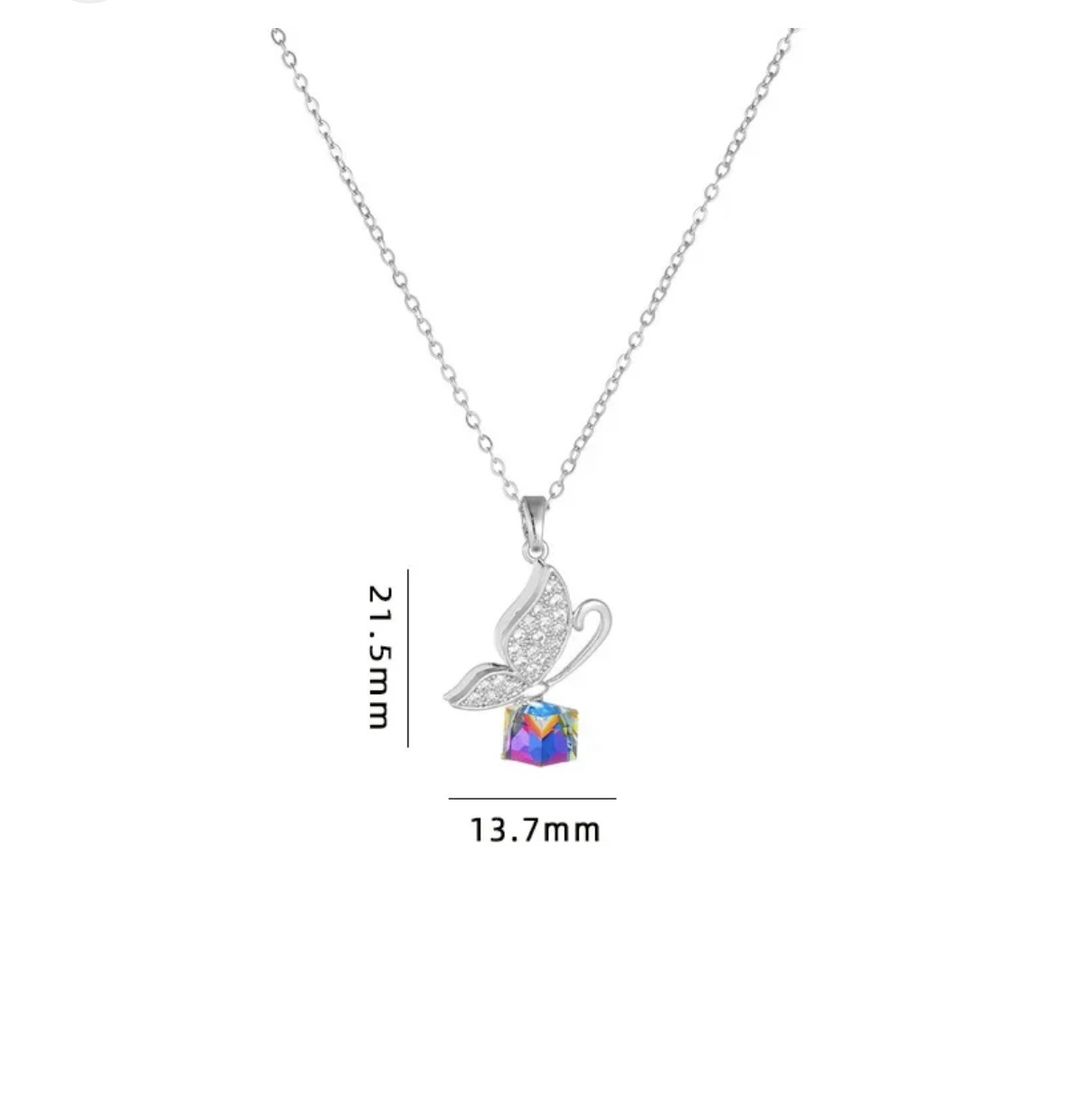 collier doré et argenté en acier inoxydable avec un pendentif papillon et un cristal différente couleur