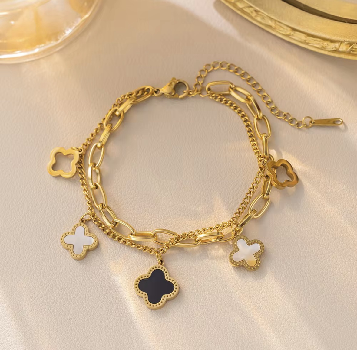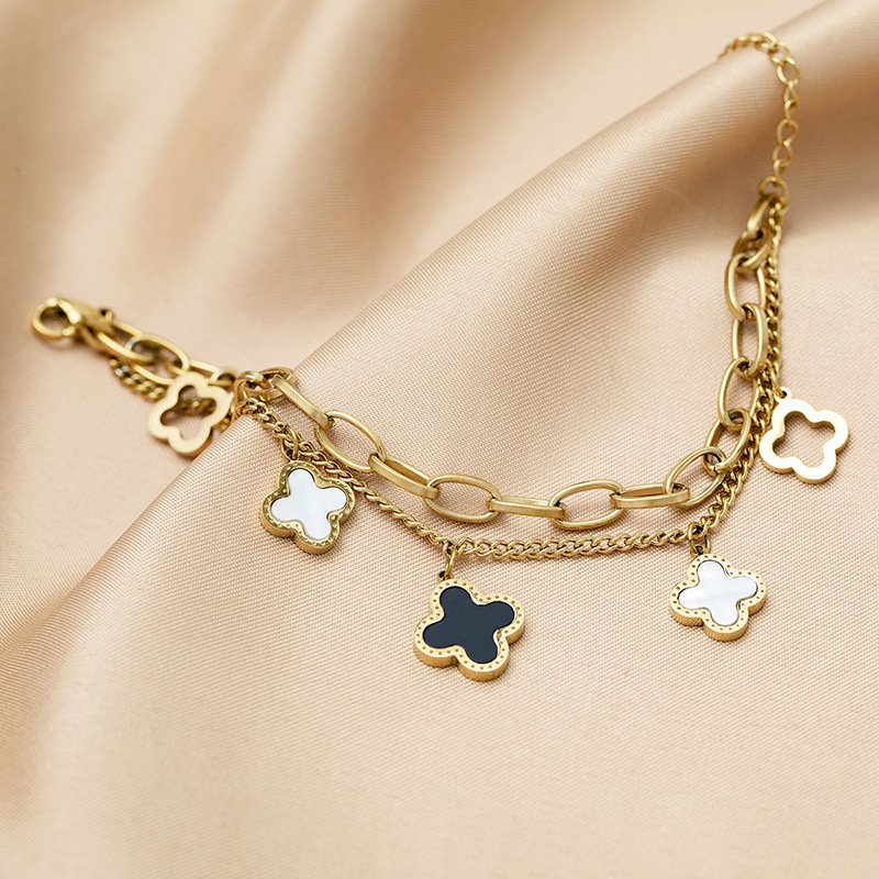 Bracelet doré en acier inoxydable avec des motifs de trèfle à quatre feuilles, dont certains sont incrustés de nacre blanche et d’onyx noir.