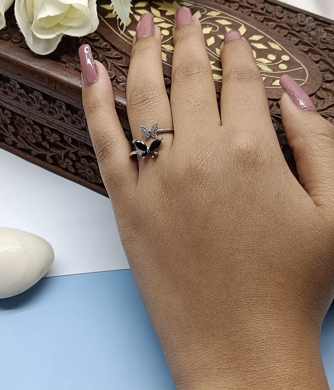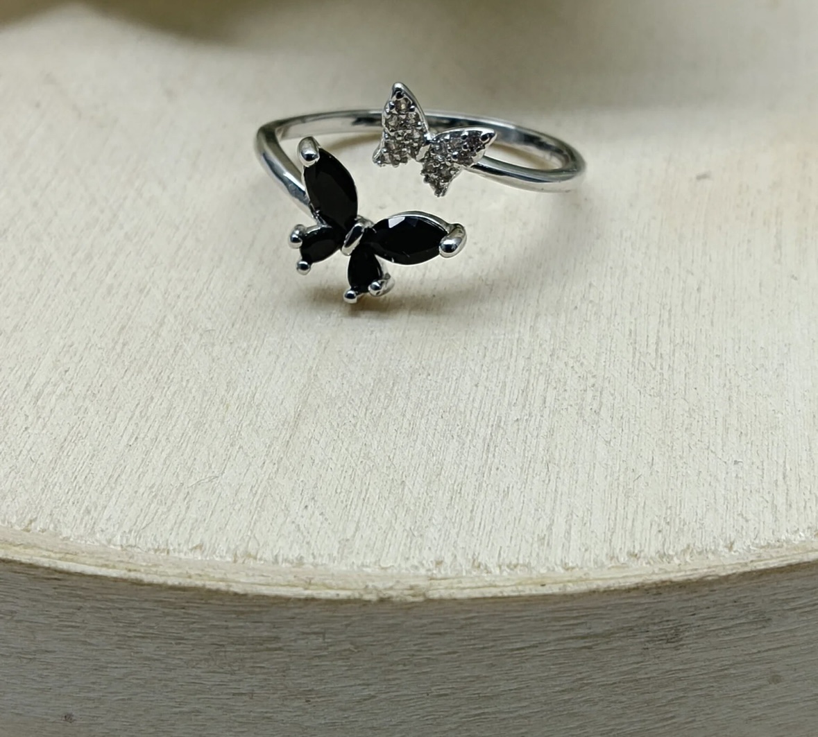 bague papillon argentée en acier inoxydable réglable ornée d’oxydes de zirconium noirs et brillants.
